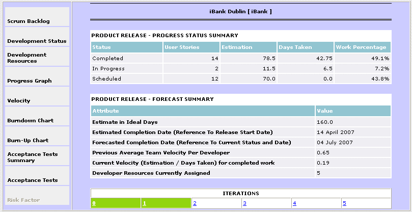 velocity, estimated remaining and future effort, and historical release activity reports.